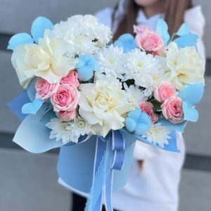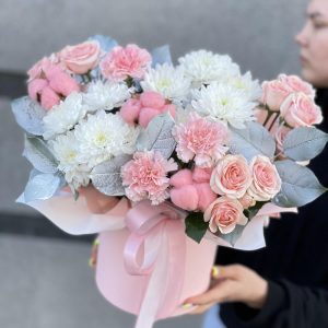ФРАНЦУЗСКАЯ РОЗА,ХРИЩАНТЕМА КУСТОВАЯ И АЛЬСТРОМЕРИЯ В ШЛЯПНОЙ КОРОБКЕ